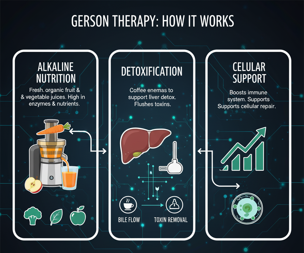 Gerson Therapy is a historically significant but medically controversial detox protocol. While its emphasis on plant-based nutrition and reduced processed foods may offer general health benefits, its more extreme practices — such as coffee enemas and high-volume juicing — carry risks and lack scientific validation.